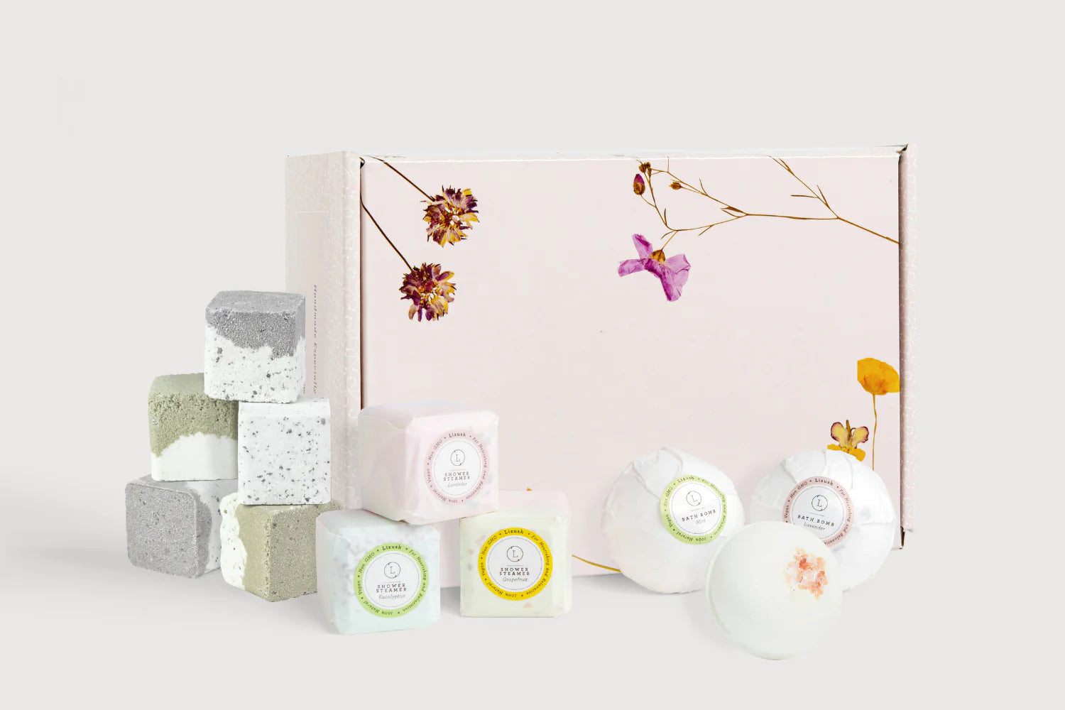 Experience ultimate relaxation with our Fizzes for your Bath and Shower set. This luxurious set includes 3 bath bombs and 8 shower steamers, each infused with essential oils and measuring 2'' in diameter. Perfect as a lavish home spa gift, it comes beautifully packaged in a customizable gift box with the option to personalize with a name on the lid.