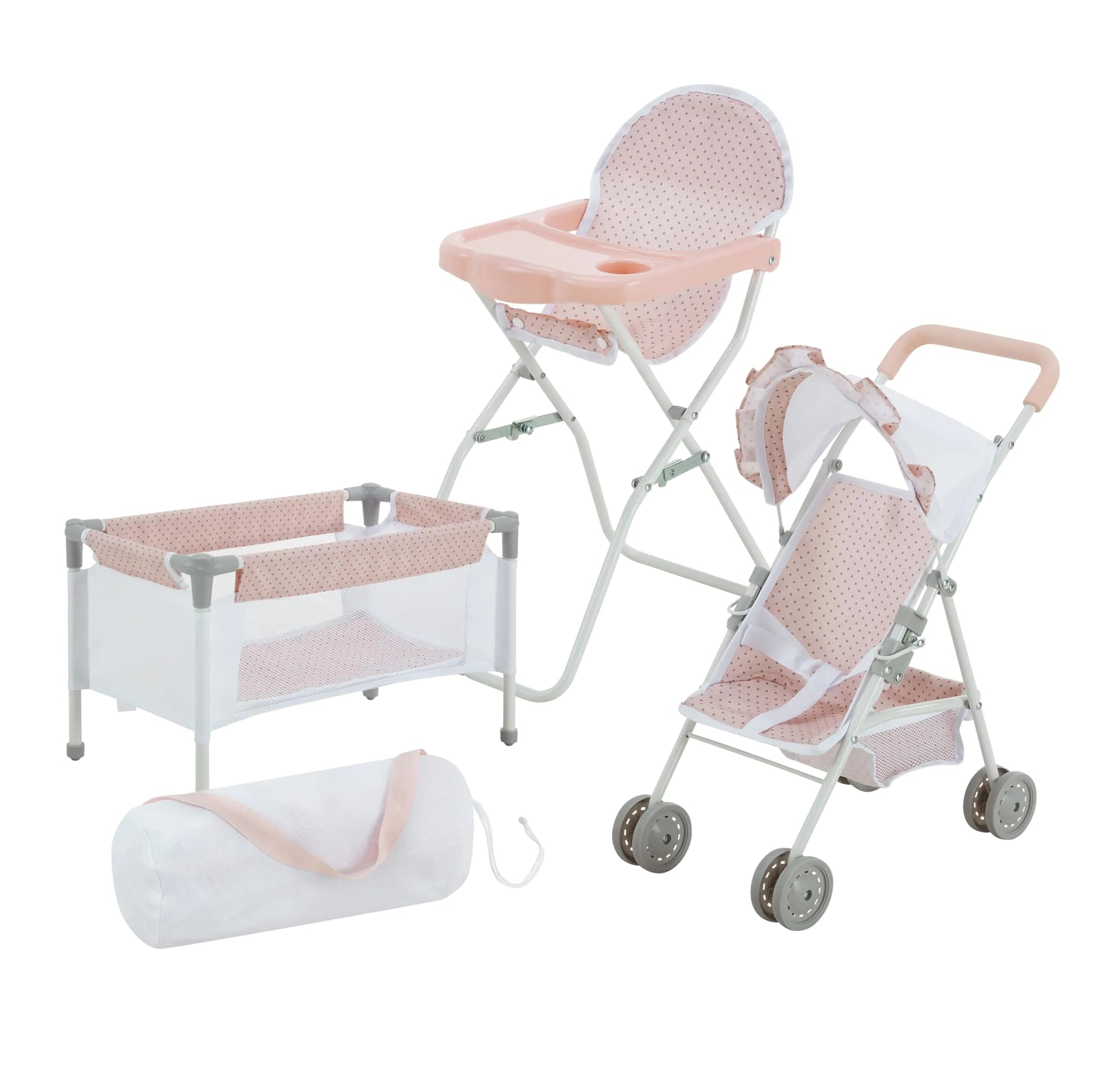 Experience the joys of parenting with the Olivias Little World Polka Dot Princess Baby Doll 3pc Nursery Set. This charming collection features three essential pieces: a collapsible high chair, a folding umbrella stroller with a canopy, and a pack-and-play style crib, tailored for 15" dolls and stuffed animals. It's perfect for fostering imaginative play.